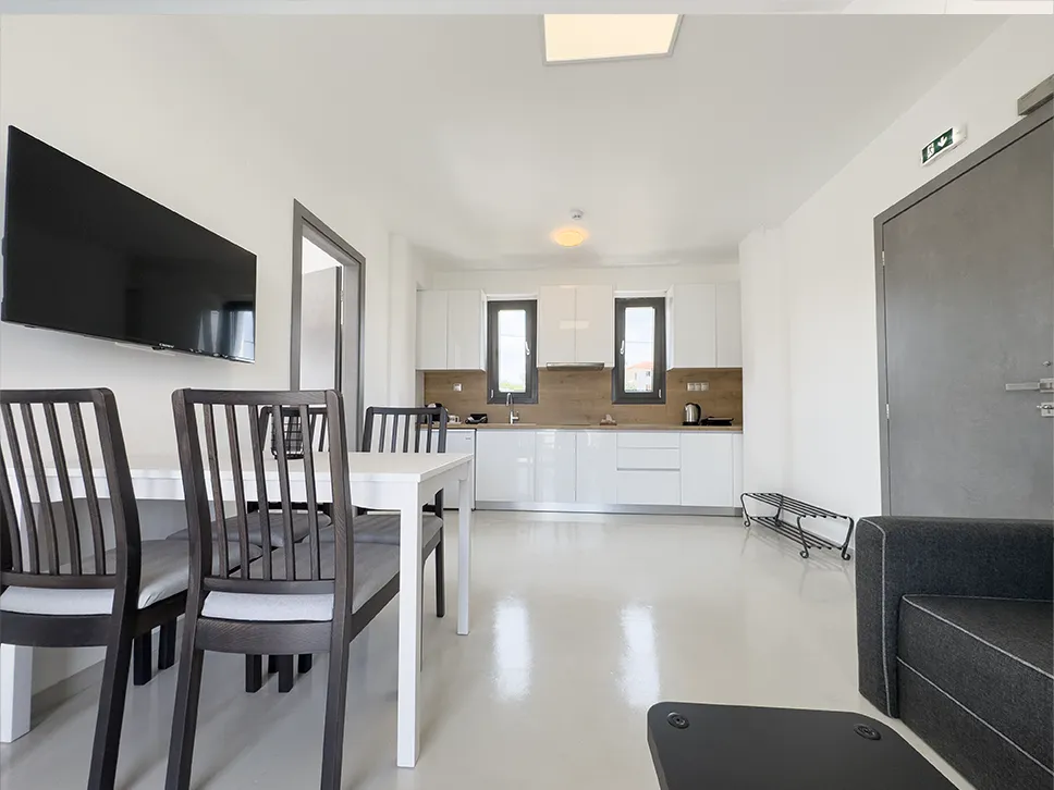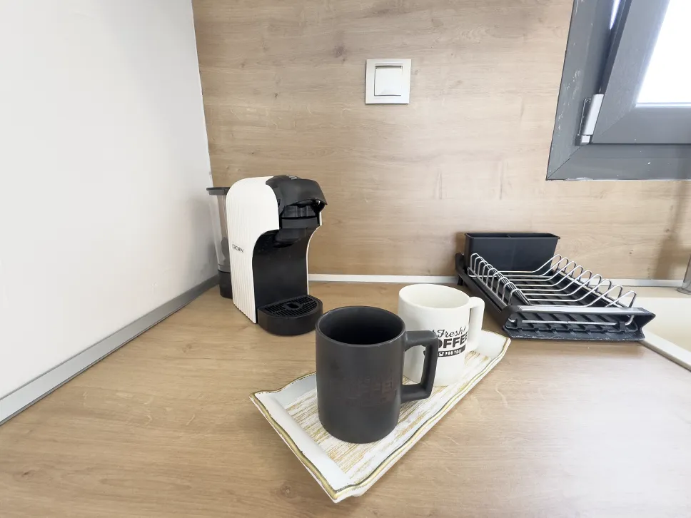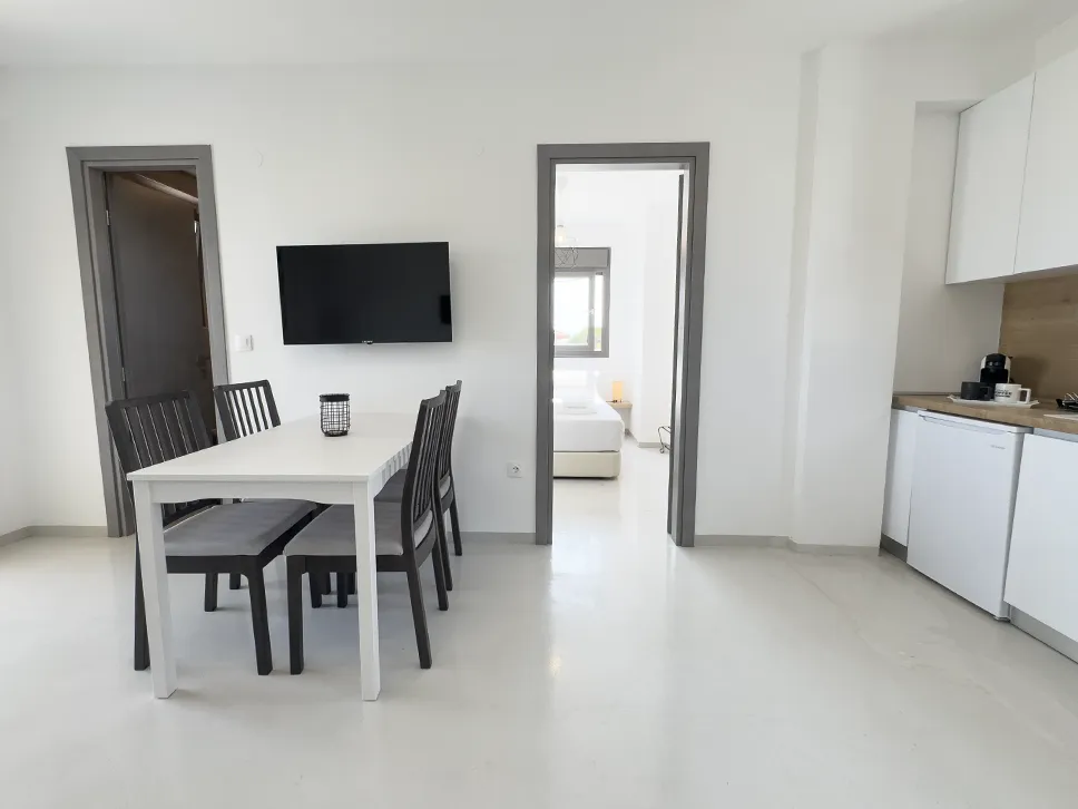 Η πλήρως εξοπλισμένη κουζίνα σας δίνει τη δυνατότητα να ετοιμάζετε εύκολα τα αγαπημένα σας γεύματα. Διαθέτει ψυγείο, εστίες μαγειρικής, τοστιέρα, καφετιέρα, βραστήρα, μαγειρικά σκεύη και σερβίτσια. Η τραπεζαρία, εσωτερική ή εξωτερική στο μπαλκόνι, σας επιτρέπει να απολαμβάνετε το φαγητό σας όπως προτιμάτε.