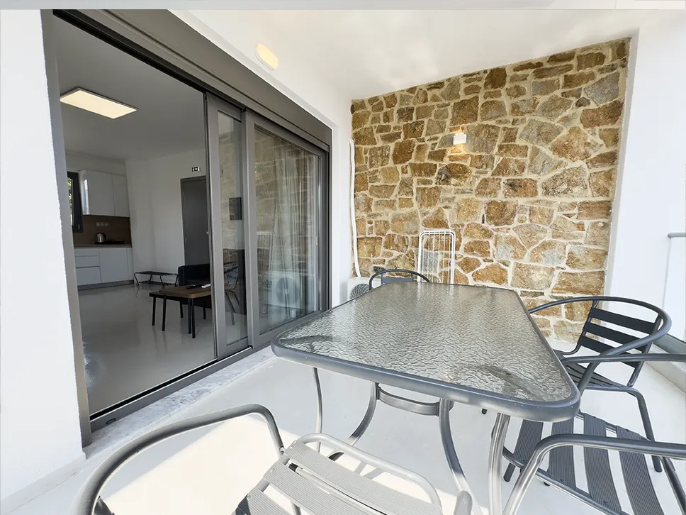 Το ευρύχωρο μπαλκόνι, εξοπλισμένο με άνετα καθίσματα και τραπέζι, είναι το ιδανικό σημείο για τον πρωινό σας καφέ ή ένα χαλαρό ποτό το βράδυ, απολαμβάνοντας την όμορφη θέα.